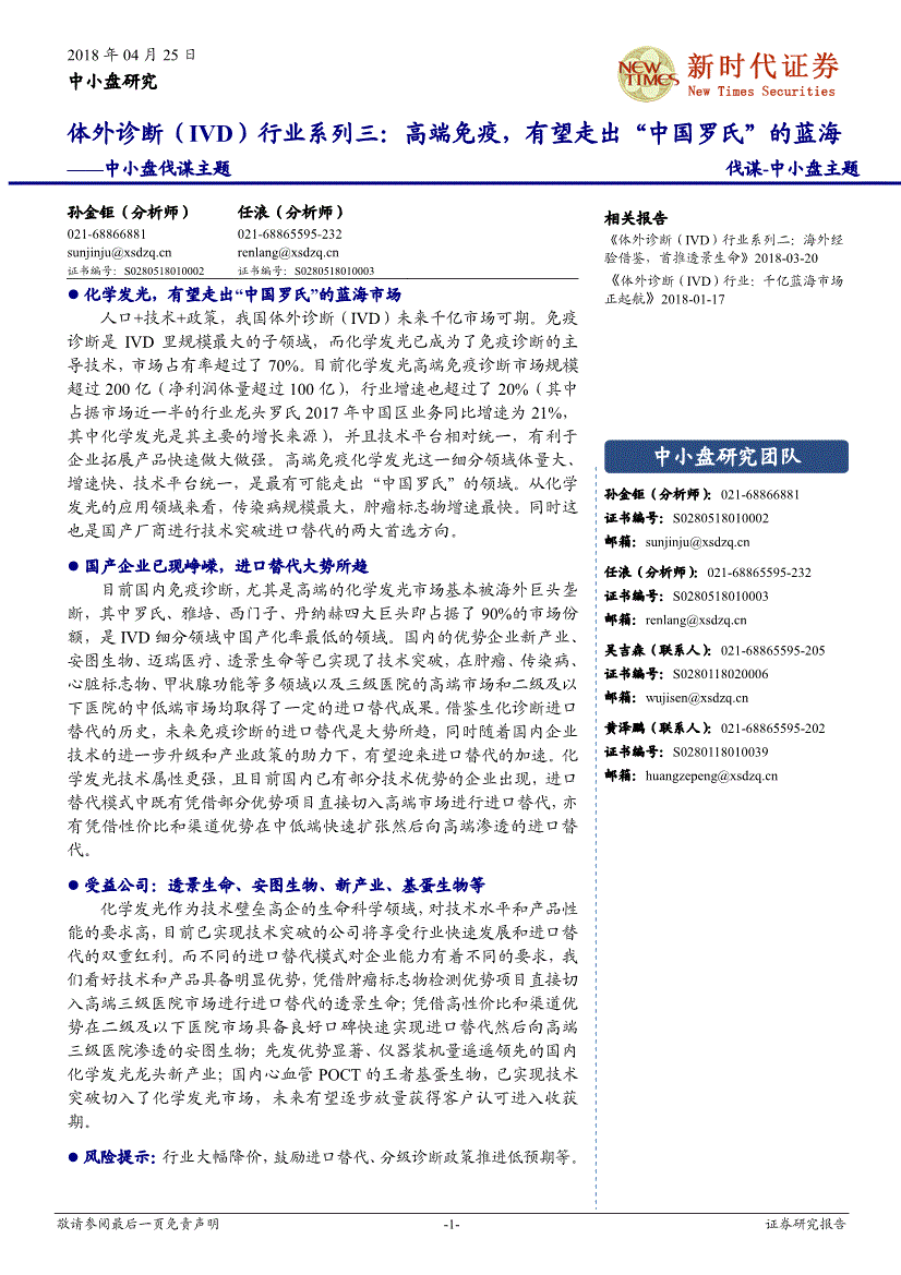 目前体外诊断来看:生化诊断试剂和仪器国产化都已经取得了良好的效果;分子诊断本身国内外技术发展的差异不大,国内市场一直1980-1990 代理试剂1990-2000 自产试剂2000-2005 仪器研发2005至今 仪器替代0% 2% 4% 6% 8% 10% 12% 14% 0.0 2.0 4.0 6.0 8.0 10.0 12.0安图生物深圳迈瑞外资占领生化市场,国内企业靠经销获得部分利润,国产市占率极低国内企业试剂技术到位,降价近一半,进口仪器被迫从封闭变为开放研发出参数一致的生化分析仪,成本远低于外资从二级医院开始,逐步进入三级医院,市占率超过一半2018-04-25中小盘研究 -10-证券研究报告都是国内企业占据主导;POCT而言在润达医疗收购深圳瑞莱之后国内企业市场占有率也已超过了30%。